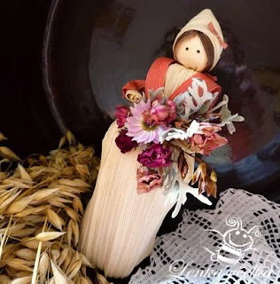 Panenka s bedýnkou s jablky. Doplňky jsou vyrobeny z přírodních. Návod jsem tehdy na internetu nenašla vůbec žádný. Zabývám se ruční výrobou a prodejem figurek z kukuřičného šustí. Dále realizuji betlémy do skořápek kokosových ořechů a makoviček.